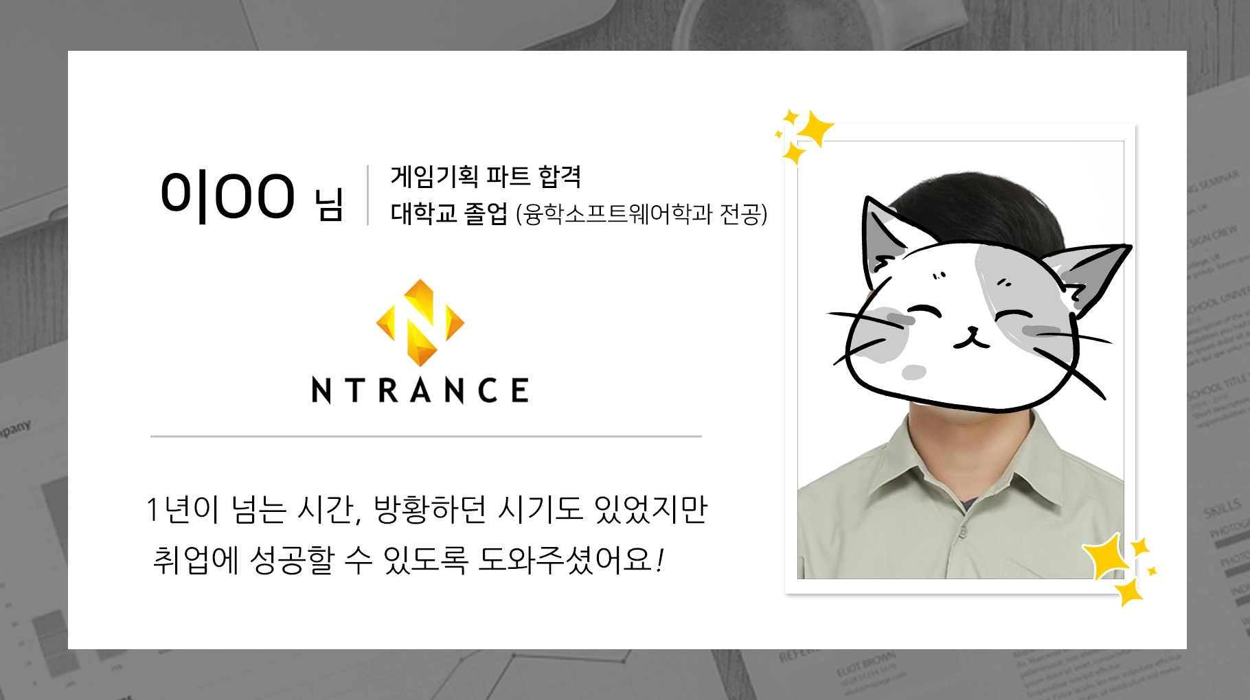 1년이 넘는 시간을 준비하면서 지치고 방황하던 시기도 있었는데요, 그 때마다 원장님이 포기하지 않고 계속 이끌어주셔서 저도 포기하지 않고 노력했어요. 덕분에 취업이라는 멋진 결과를 얻어낼 수 있었습니다!