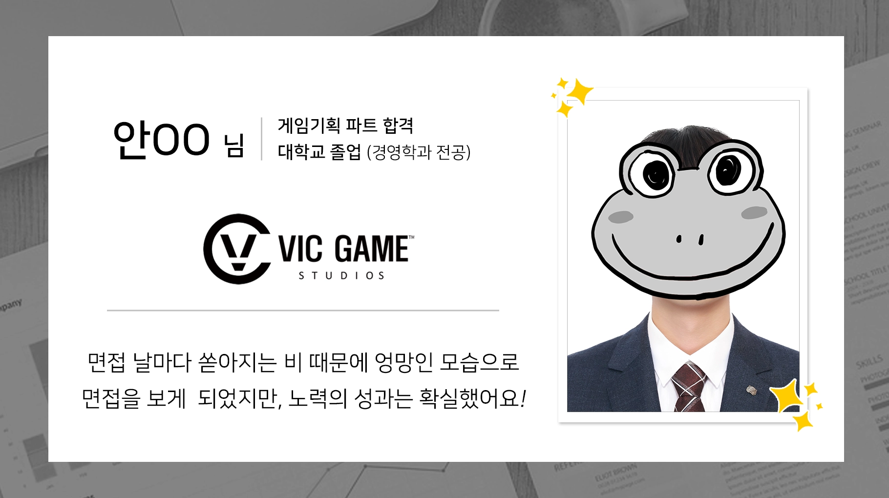 A. 한때 진로에 대해 깊은 고민을 한 적이 있었는데, 인생 전반에 걸쳐 함께한 게임을 직접 만들어보고 싶다는 생각에서 시작되었습니다. 그 중에서도 게임의 재미를 설계하는 기획 직군에 가장 관심이 가면서 선택하였습니다.