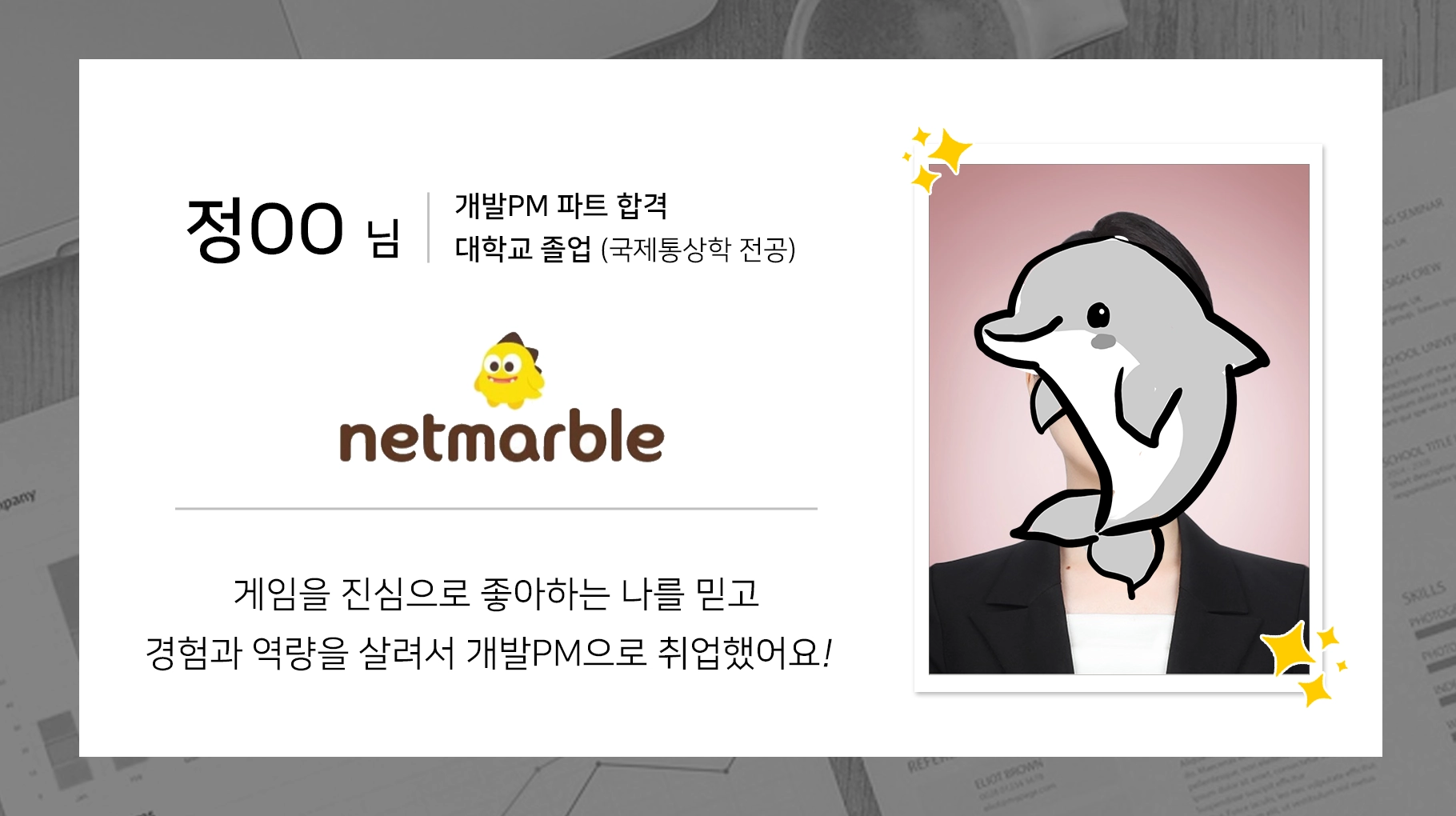 원래 대학에서 전공했던 것이 적성에 맞지 않아 고민하던 차에, 게임을 진심으로 좋아하는 나를 믿기로 했어요. 그 뒤로 내 경험과 역량을 살릴 수 있는 개발PM 직군으로 준비해서 취업했습니다!