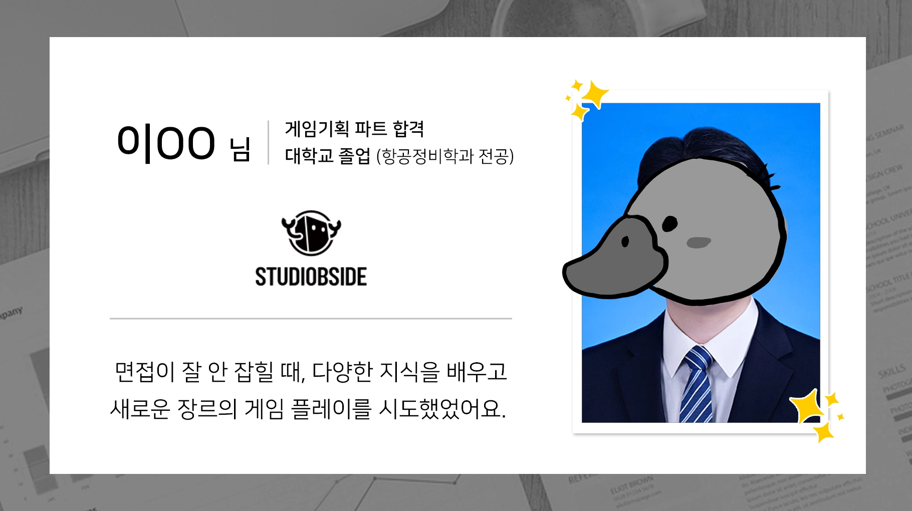 저는 게임 업계를 2년 정도 준비했습니다. 긴 시간이다 보니 힘들 때가 참 많았습니다. 특히 면접이 잘 안 잡힐 때 가장 큰 스트레스를 받았었는데요, 그럴 때마다 기획자의 기본 소양인 다양한 지식을 쌓기 위해 더 배우고, 새로운 장르의 게임 플레이를 하면서 게임 스펙트럼을 넓히려고 많이 노력했었습니다. 노력의 결실을 맺게 되어 정말 기쁩니다!
