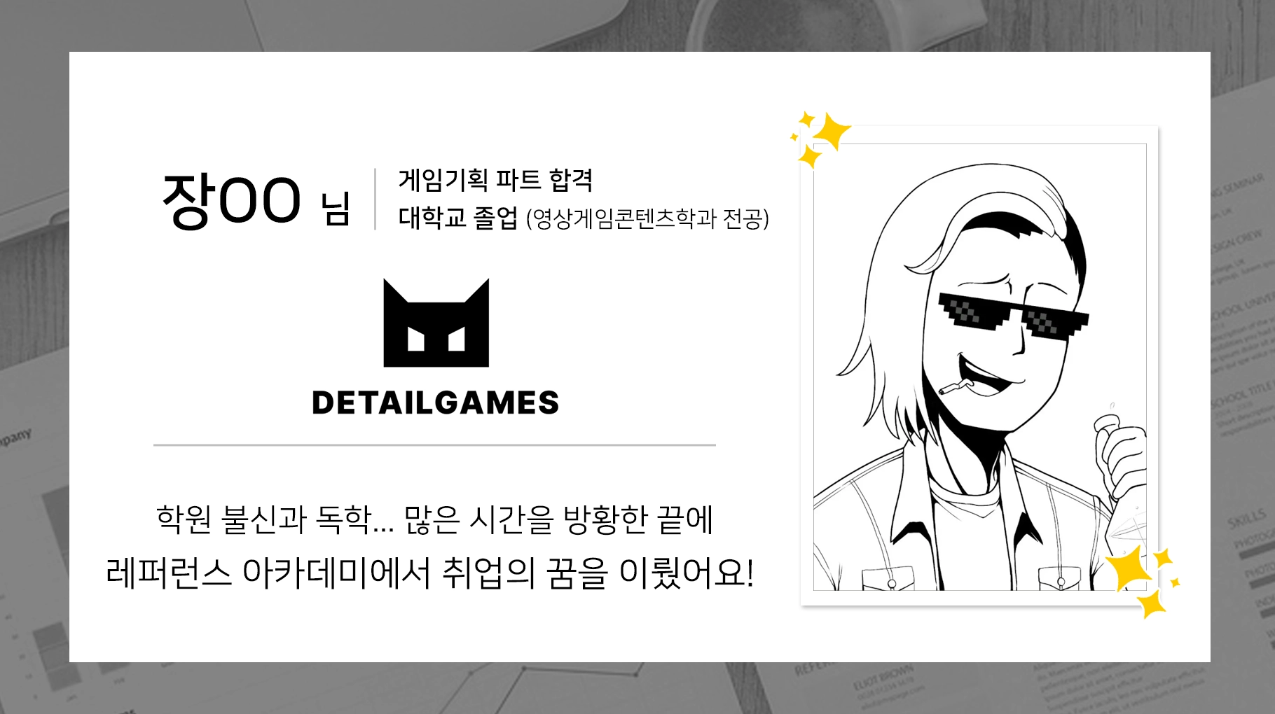 이전에 다녔던 학원에서 학원에 대한 불신이 생겼고, 그렇게 독학을 시작했지만 너무 어렵고 불안했었습니다. 그러던 중 게임기획 오픈 카톡방을 알게 되었고, 거기서 알게 된 레퍼런스 아카데미에 등록하여 마음 다 잡고 공부한 끝에 취업의 꿈을 이뤘습니다.