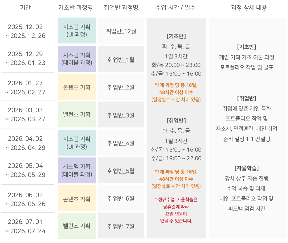 [게임 기획] 커리큘럼 일정 안내 (미인증 훈련과정)